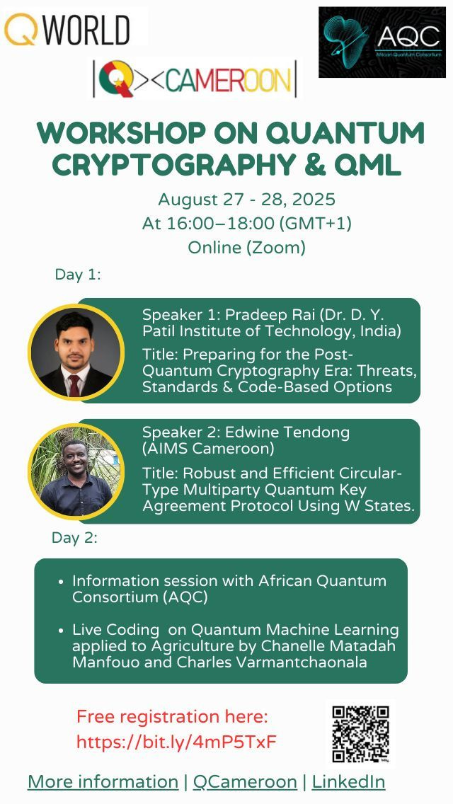 This two-day online workshop, organized by QCameroon, will feature invited talks on Quantum Cryptography (Day 1) and a hands-on coding workshop on Quantum Machine Learning for agriculture (Day 2).